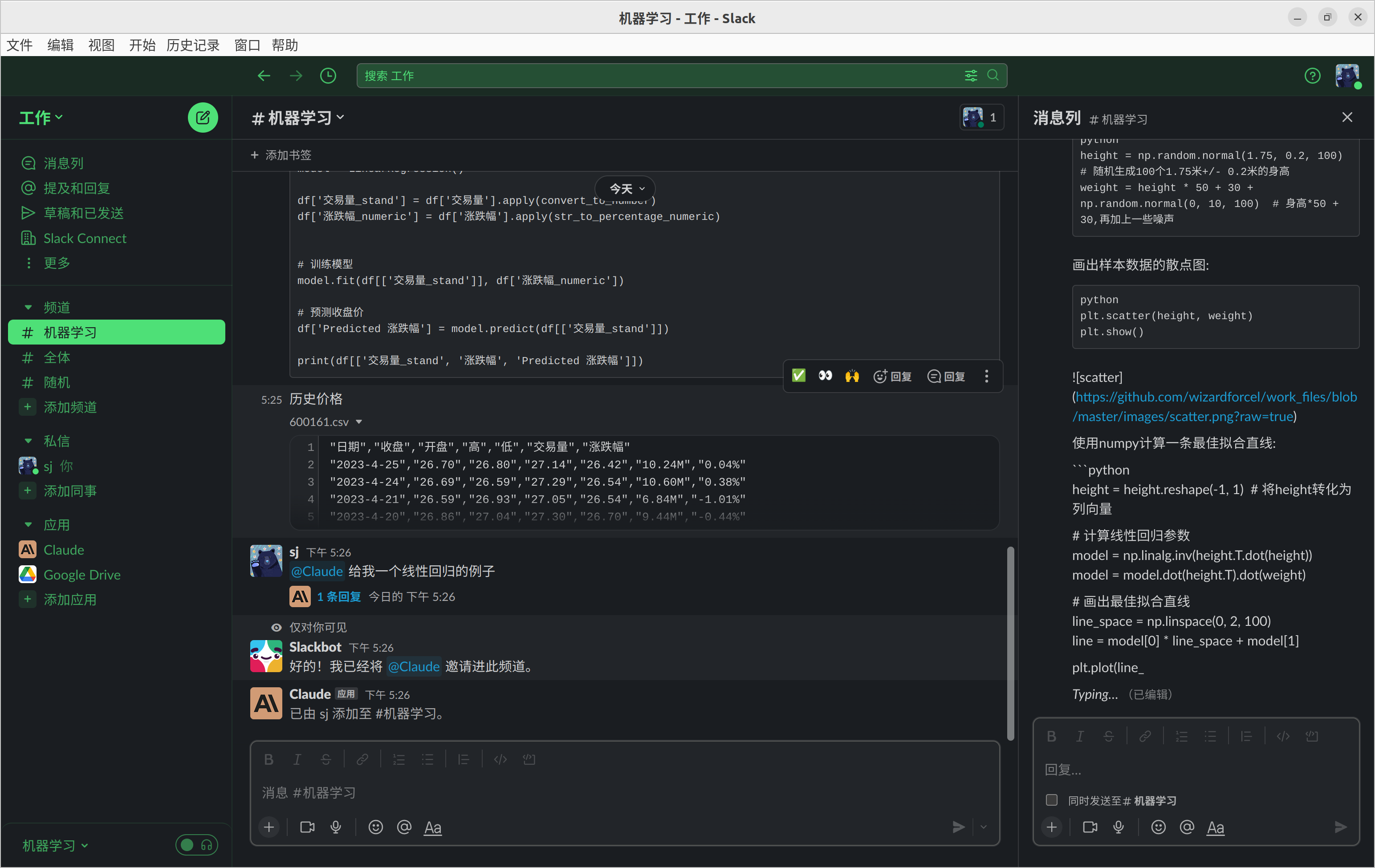 Claude是和GPT类似的模型,Ubuntu系统上体验很容易,应用商店里搜索安装Slack,然后在Slack里安装Claude应用,就可以体验了。